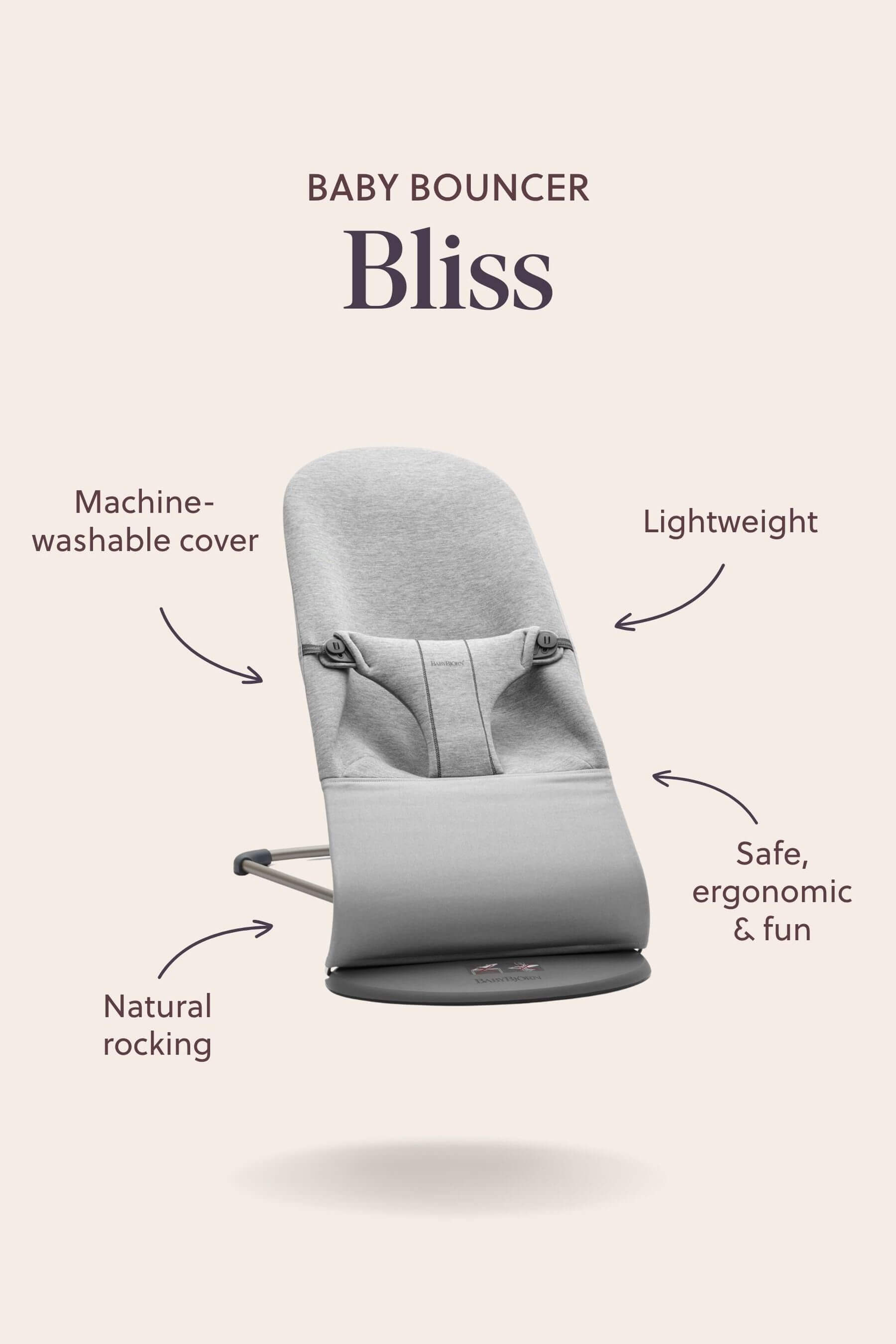 New Bouncer Bliss is a cosy place for your baby to play or rest close by you, while you take a shower or prepare a meal. When your baby kicks their legs or waves their arms, the baby bouncer rocks gently. No batteries needed – the baby bouncer runs on pure fun! Playing in the baby bouncer also helps your baby to develop their motor skills and balance. Bouncer Bliss can be used from newborn and up to the age of 2 years.