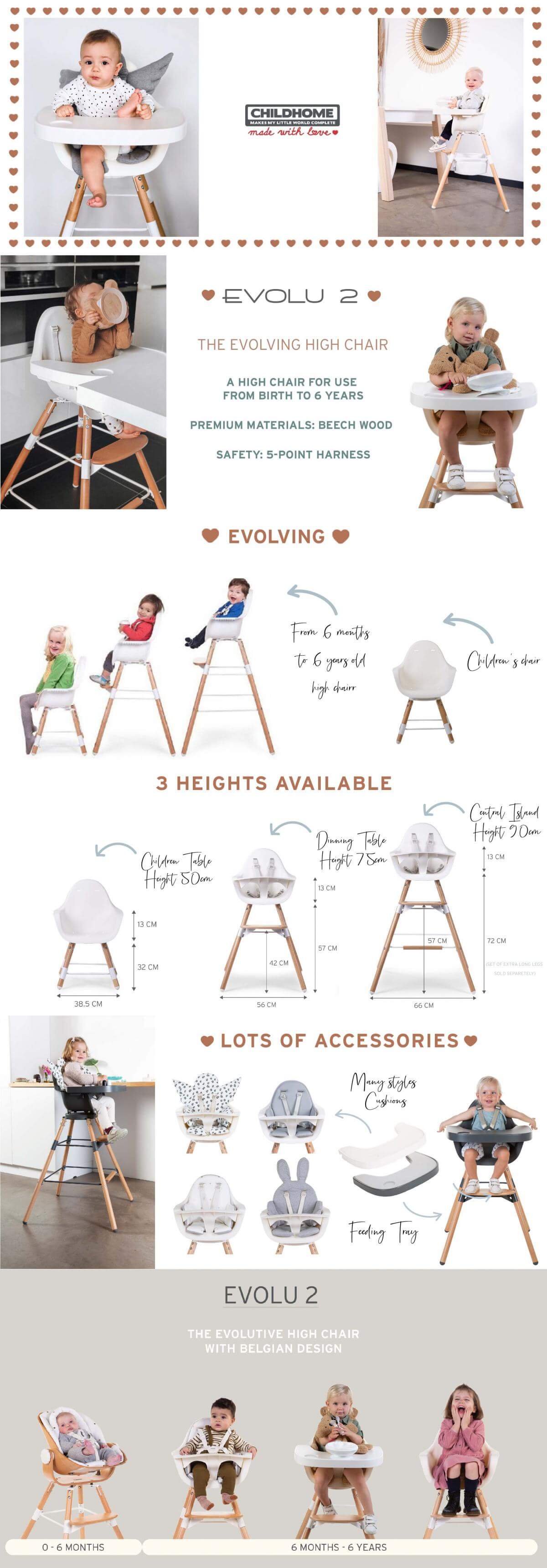 This trendy 2-in-1 high chair can be adjusted to 2 table heights: a standard dining table of 75 cm and a children's table of 50 cm. A set of extra-long legs is optionally available to adjust the height of the high chair to a kitchen island of 90 cm. Thanks to the easy assembly, changing height is very easy. The child's seat can also be used from birth in combination with the Evolu Newborn Seat. The depth-adjustable feeding tray is optionally available, so your child has his / her own table. The Evolu 2 high chair has a 5-point safety belt and a detachable safety bumper to ensure your child's safety.