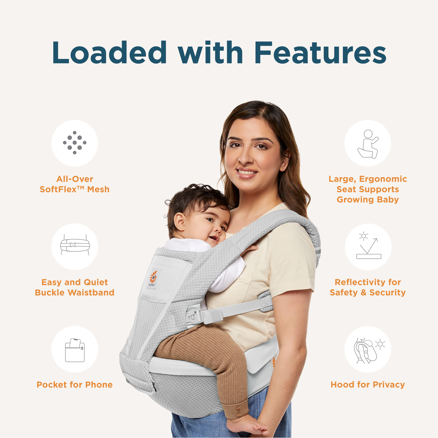 - Multiple carry positions for babies weighing 5.5 20.4kg