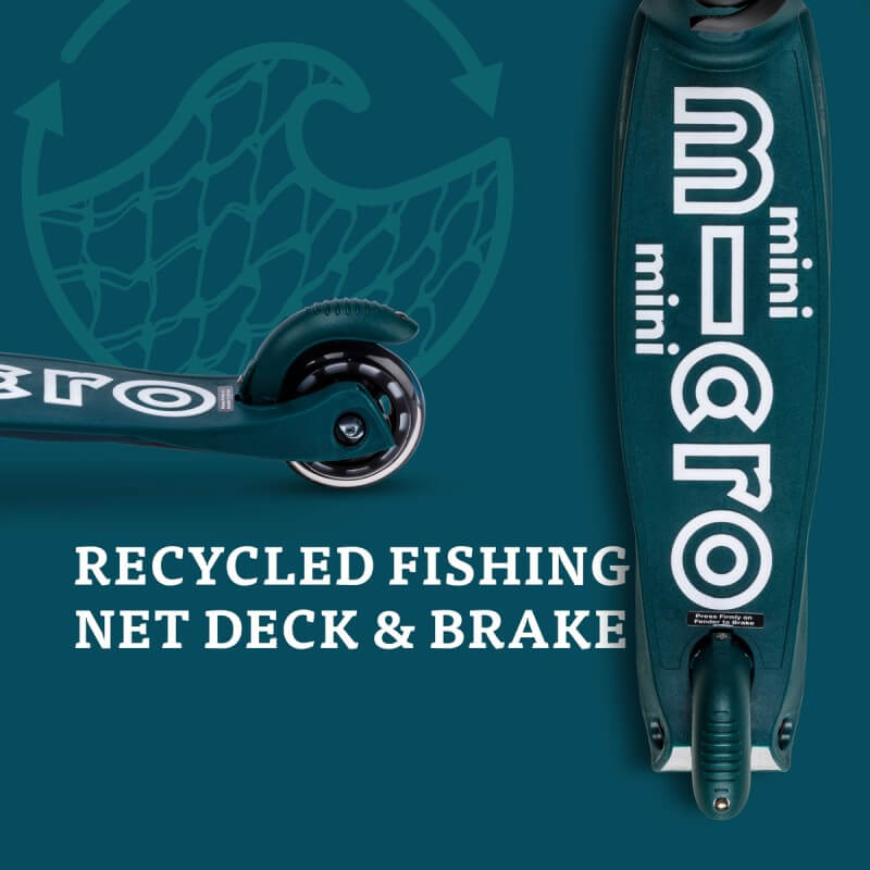 The Mini Micro Deluxe Foldable ECO LED scooter integrates sustainability with functionality, offering an eco-friendly choice for young adventurers. Constructed from recycled ocean plastics, including discarded fishing gear and other maritime industry waste, this scooter underscores our commitment to environmental responsibility. Each year, approximately 640,000 tonnes of fishing nets and other equipment are abandoned in the oceans, significantly contributing to marine pollution. We repurpose these materials into the durable components of the Mini Micro Deluxe ECO, such as the footplate and brake