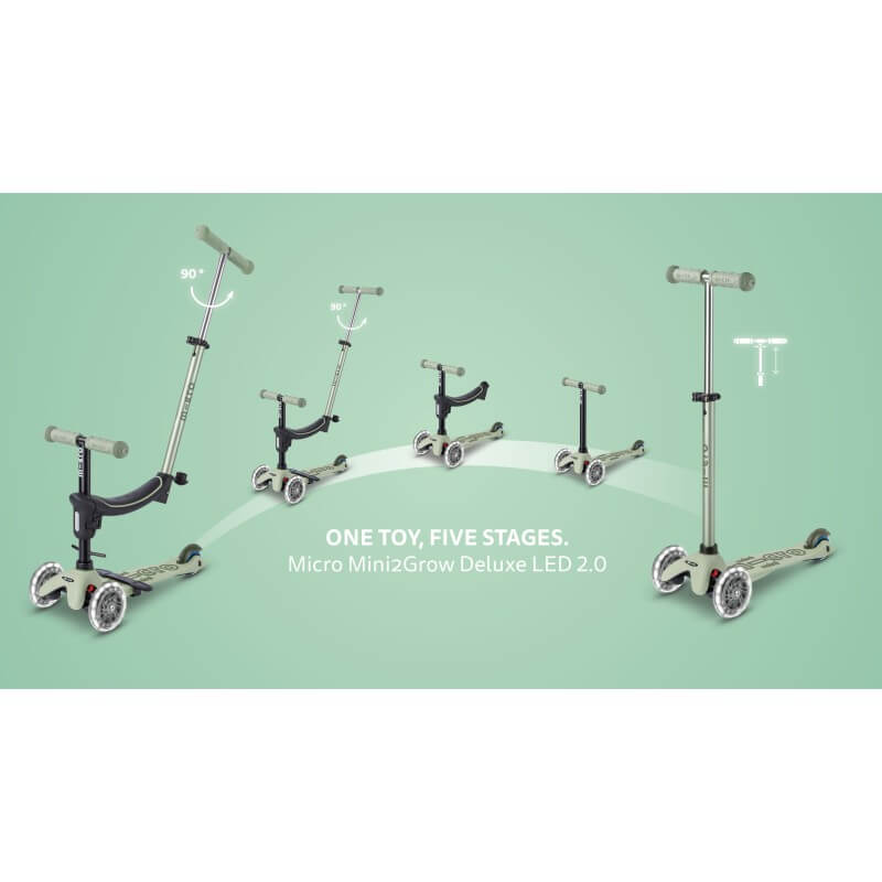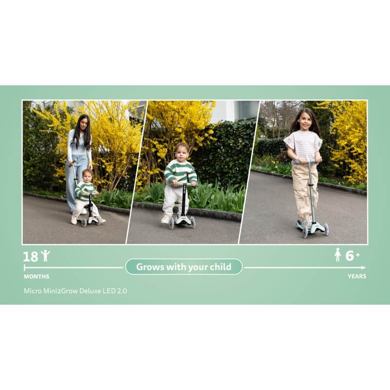 As your child grows, the Mini2Grow Deluxe LED 2.0 transforms into a ride-on scooter hybrid and finally into a classic Mini Micro Deluxe – complete with an adjustable handlebar, a patented lean-to-steer system, a grippy deck and glowing LED wheels that look great and enhance visibility during playtime. Stands out with its smart features, sleek design and long-lasting quality – making it the perfect scooter to grow up with