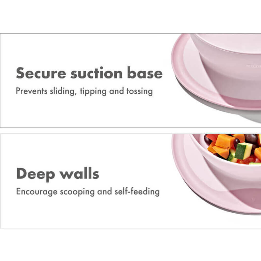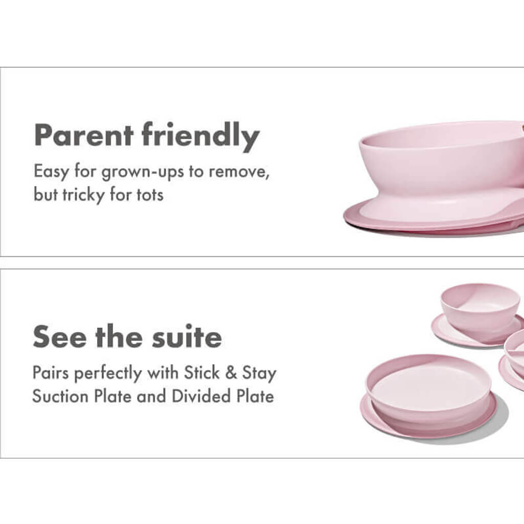 Cut down on mealtime mess with the OXO Tot Stick & Stay Suction Bowl. The Bowl features a suction base that sticks securely to surfaces until mealtime is over, preventing sliding, slipping and tipping. The parent-friendly opening makes removing the Bowl simple for adults, but tough for tots. Tall walls allow for easy scooping and encourage self-feeding. Twist the Bowl and base apart for quick cleaning in the dishwasher.