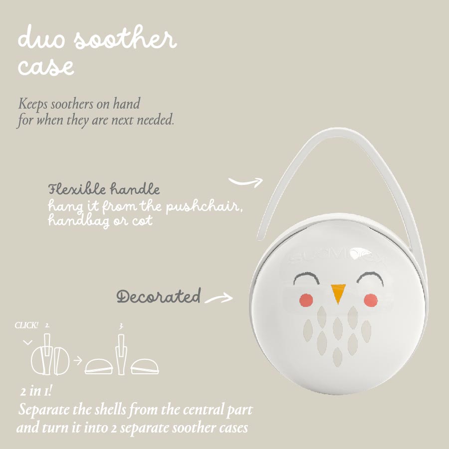 The Suavinex Duo Pacifier Case is your ultimate 2-in-1 solution for keeping pacifiers clean and within easy reach whenever you need them. Effortlessly hang this case by it’s handle from your stroller, handbag, or crib, ensuring that your pacifiers are always readily accessible. The smart 2-in-1 design allows you to easily separate into two individual soother cases, each with its own protective shell. Designed and made in Spain from Spain’s #1 bottle and pacifier brand