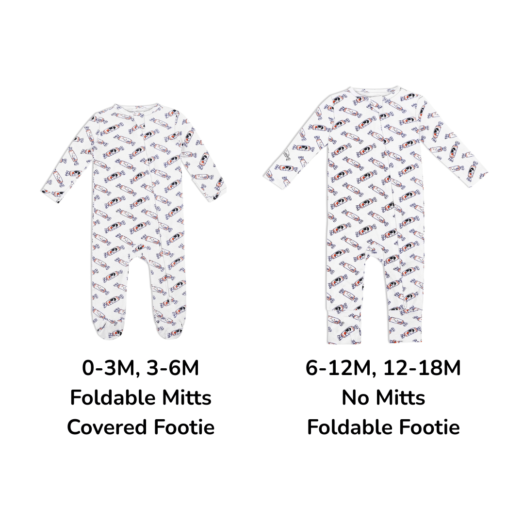 70% bamboo and 30% organic cotton with a reversible 2-way zipper; closed footie & foldable mitts for sizes 0-3M & 3-6M and foldable footies only for sizes 6-12M & 12-18M. -